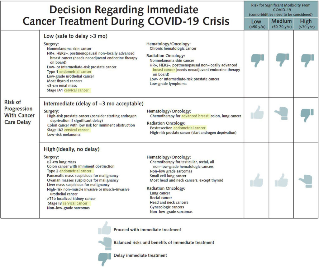 Πιο συγκεκριμένα, η αντιμετώπιση καρκίνων πρώιμων σταδίων όπως ο καρκίνος του τραχήλου της μήτρας, του ενδομητρίου, καθώς και ο καρκίνος του μαστού, μπορεί να πάρει ασφαλή «παράταση» εώς και τριμήνου, καθυστερώντας τη θεραπεία τους (όπως περιγράφεται και στον πίνακα-αλγόριθμο της Αμερικάνικης Εταιρείας Καρκίνου). Η αποφυγή ταυτόχρονης μόλυνσης από COVID-19 πρέπει να είναι η νούμερο ένα προτεραιότητα στις περιπτώσεις αυτές, οι οποίες δεν απαιτούν άμεση αντιμετώπιση.